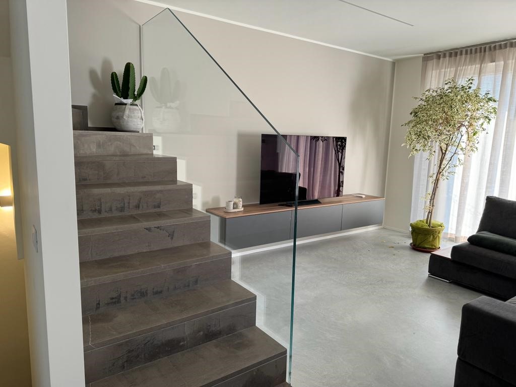 Ristrutturazione di una scala in cemento, con laggiunta di un corrimano in vetro trasparente per un tocco di modernità ed eleganza.